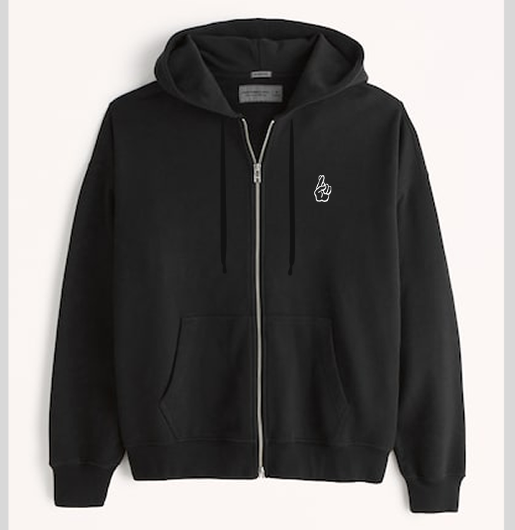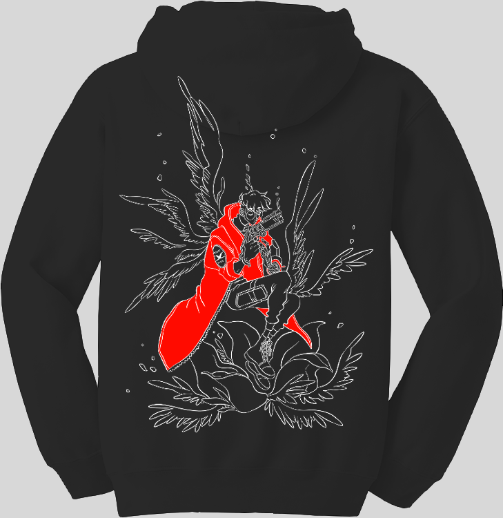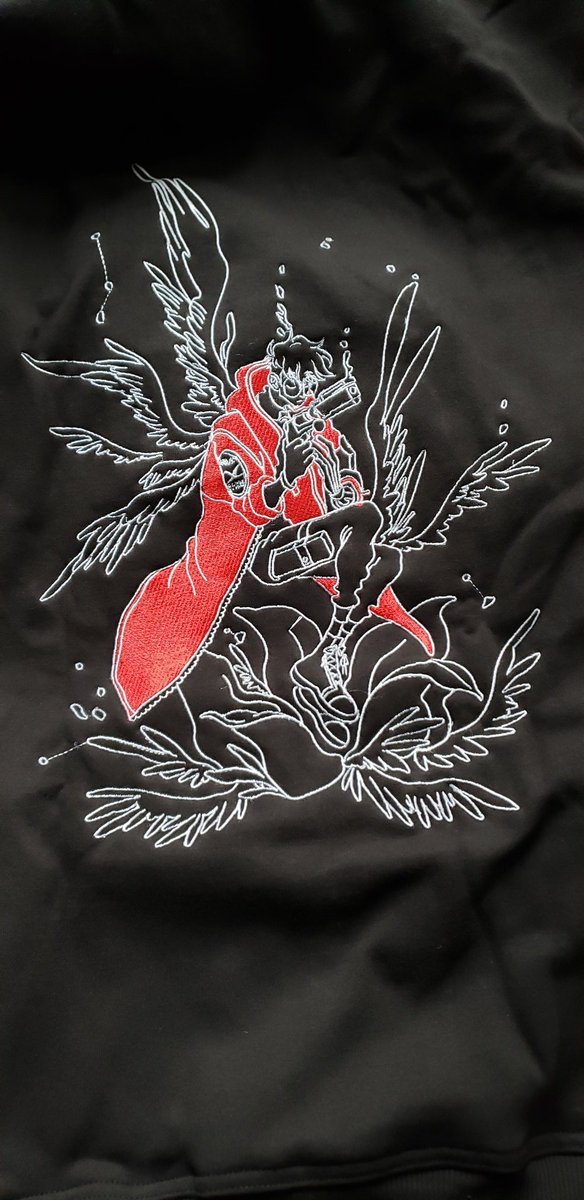 The Vash wings hoodie is a full zip hoodie with an embroidered drawing inspired by Vash from the 2023 Trigun Stampede!