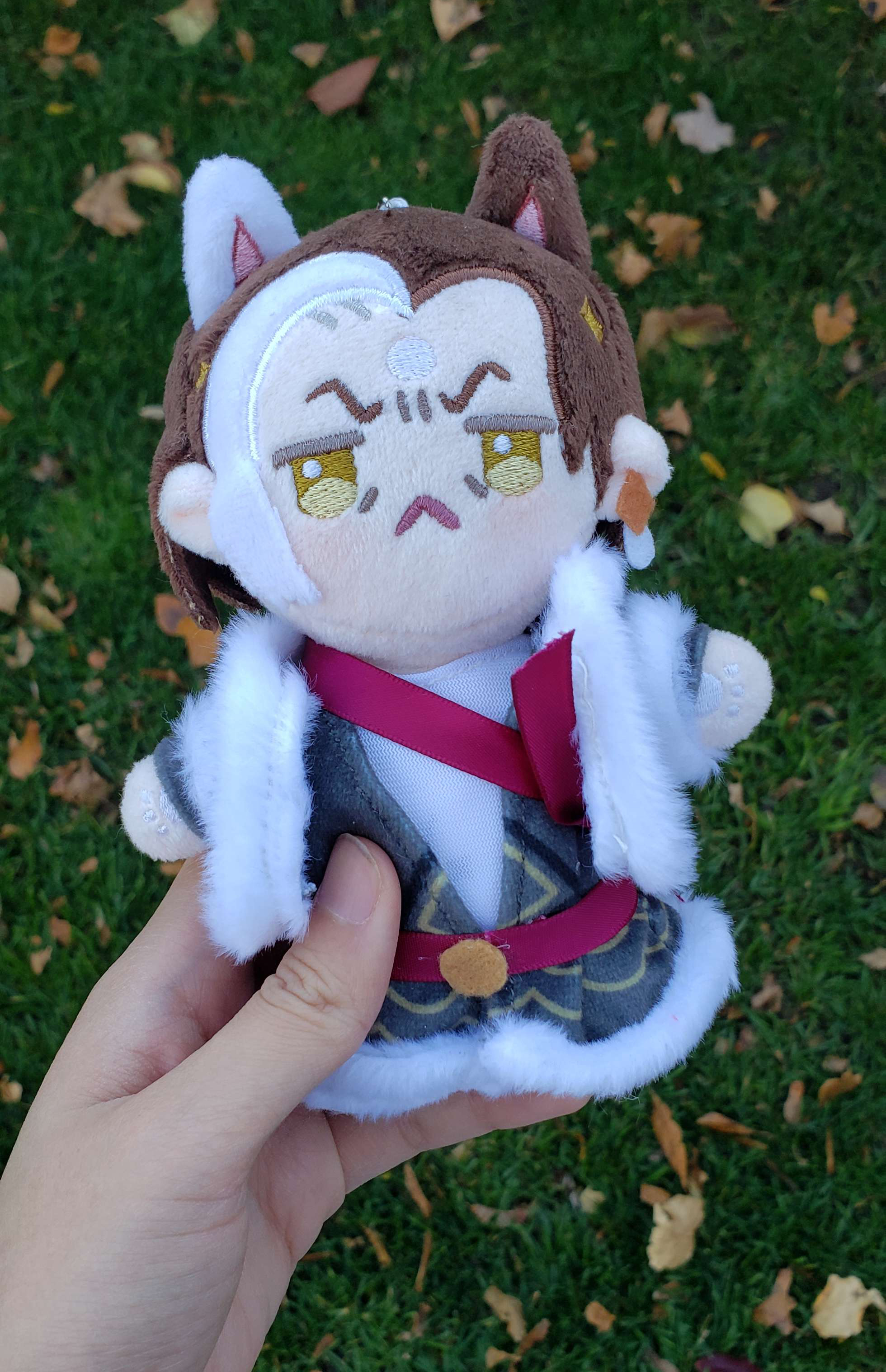 **Final plushies look slightly different from sample photos. Edits include flatter mouth and less space in-between eyes for both plushies. Hades plushie will have a smaller forehead, different top bangs, and more grey robes.**