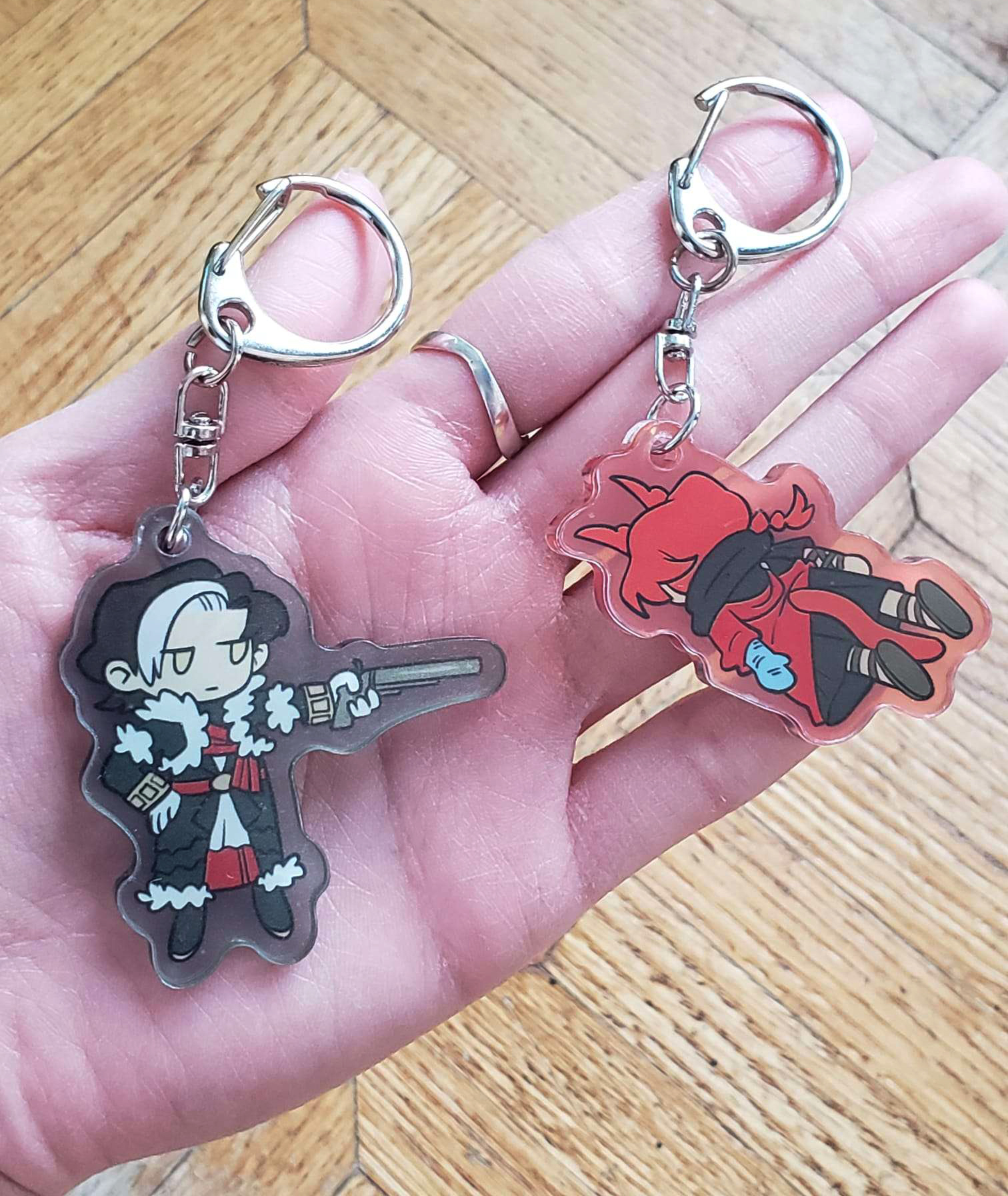 A 5 cm x 5 cm double-sided grey transparent background acrylic charm of Emet-Selch holding his iconic g/un from Shadowbringers!! They hang on a normal silver clasp so as to not take away from the action of the charm itself!!!!!